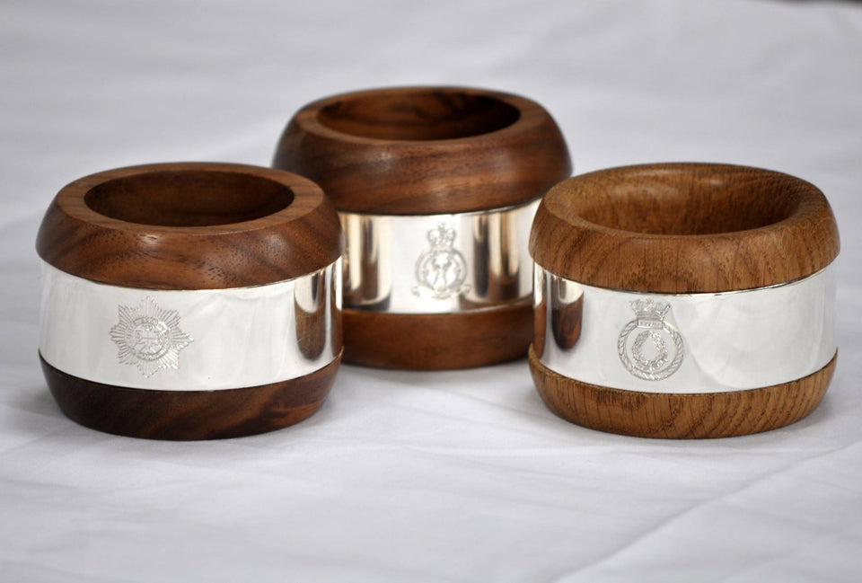 Hand turned from oak or black walnut, sterling silver band, hand-engraved with a regimental badge on one side and any details you want on the other. The rings make an ideal addition to any mess, club or association.